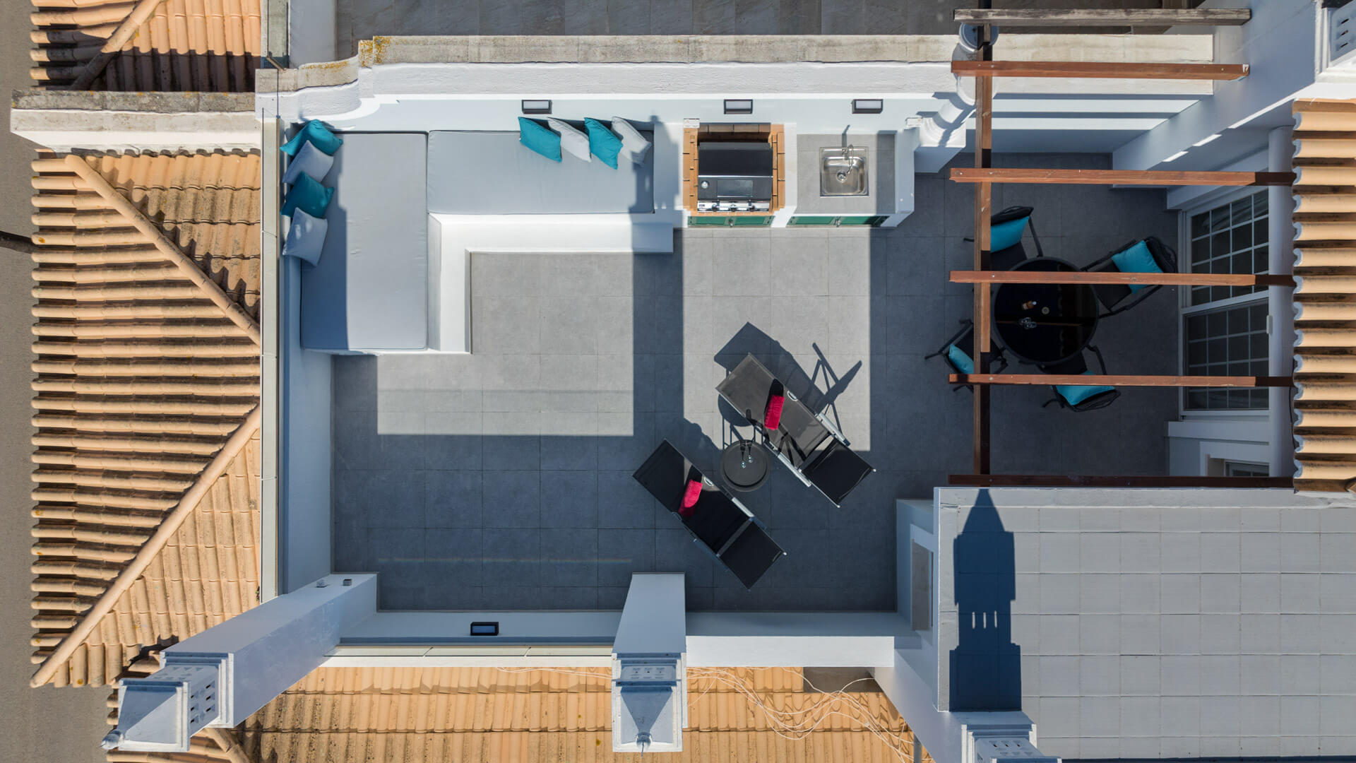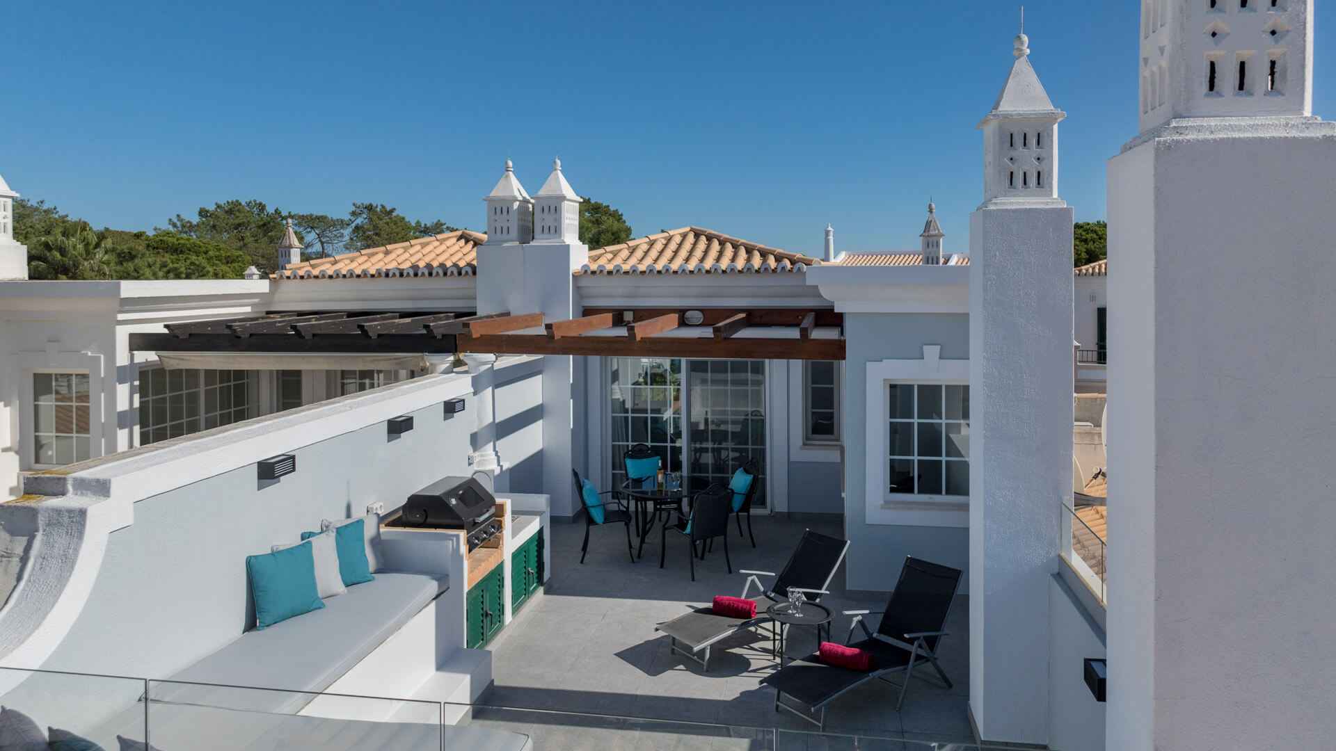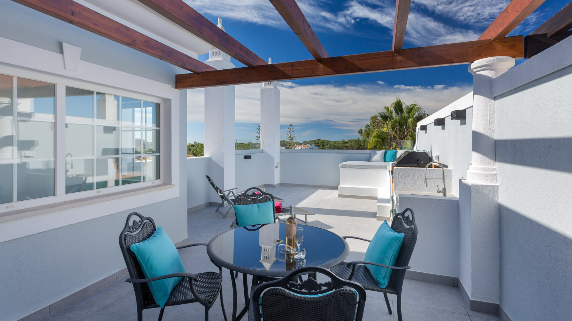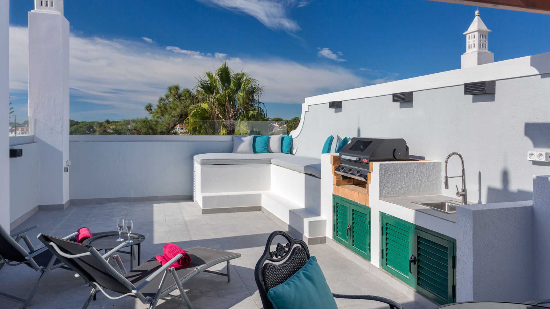 The roof terrace boasts tennis & sea views. There is plenty of sunbathing space, BBQ and ample indoor storage space.