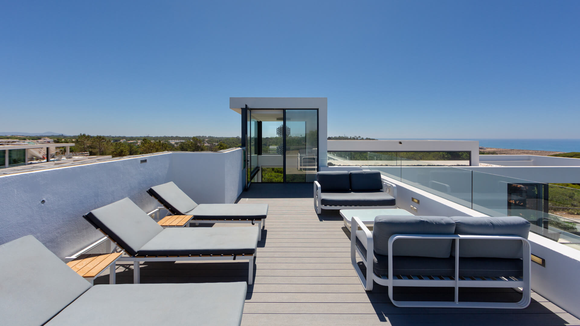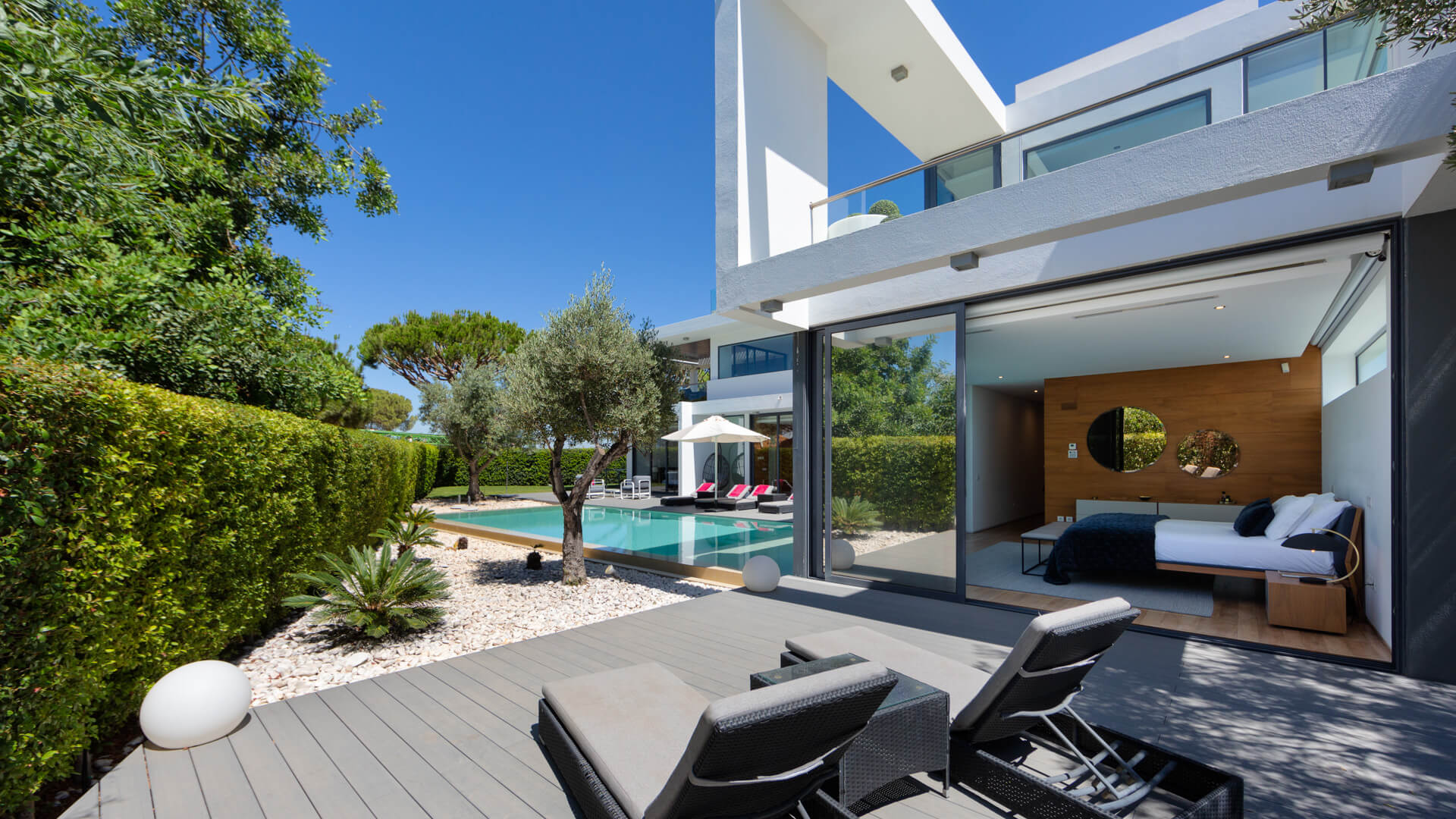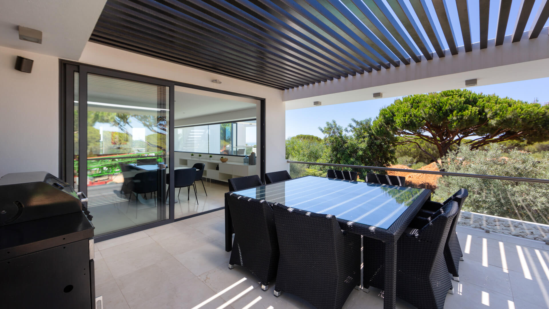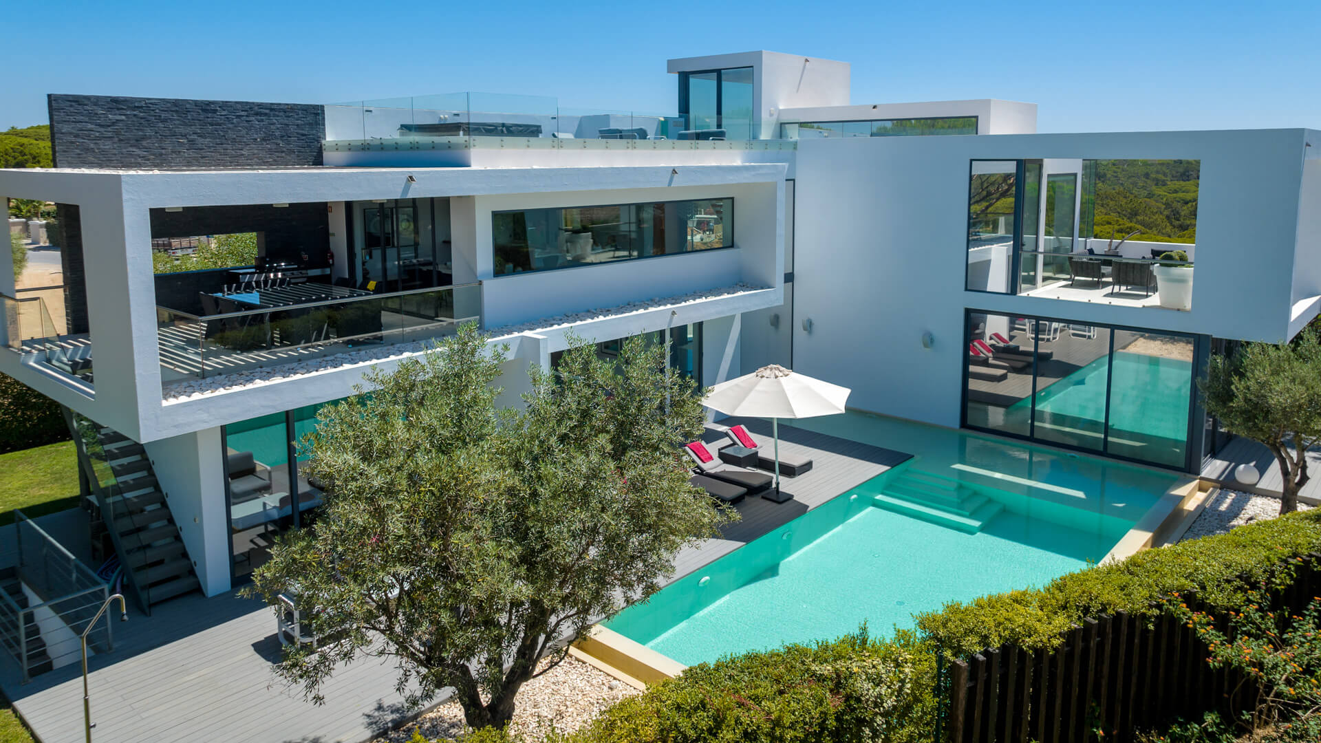 The first floor comprises the living room, modern kitchen and dining area with two distinct terrace areas – one with lounge furniture and the other with a BBQ and dining table.