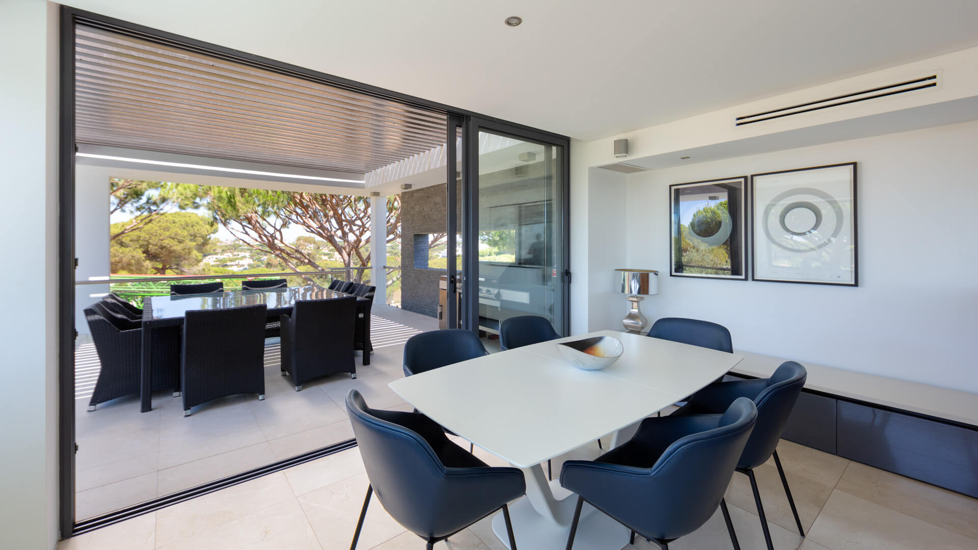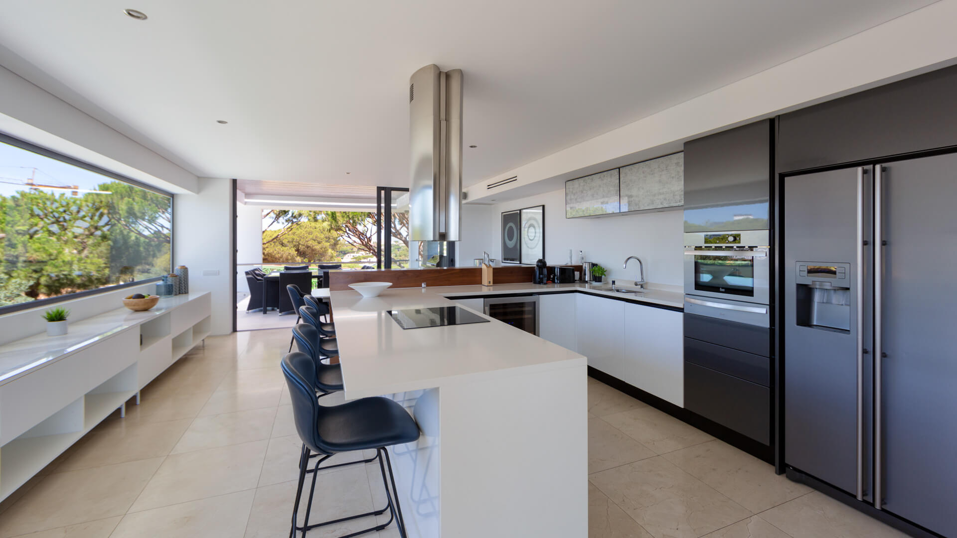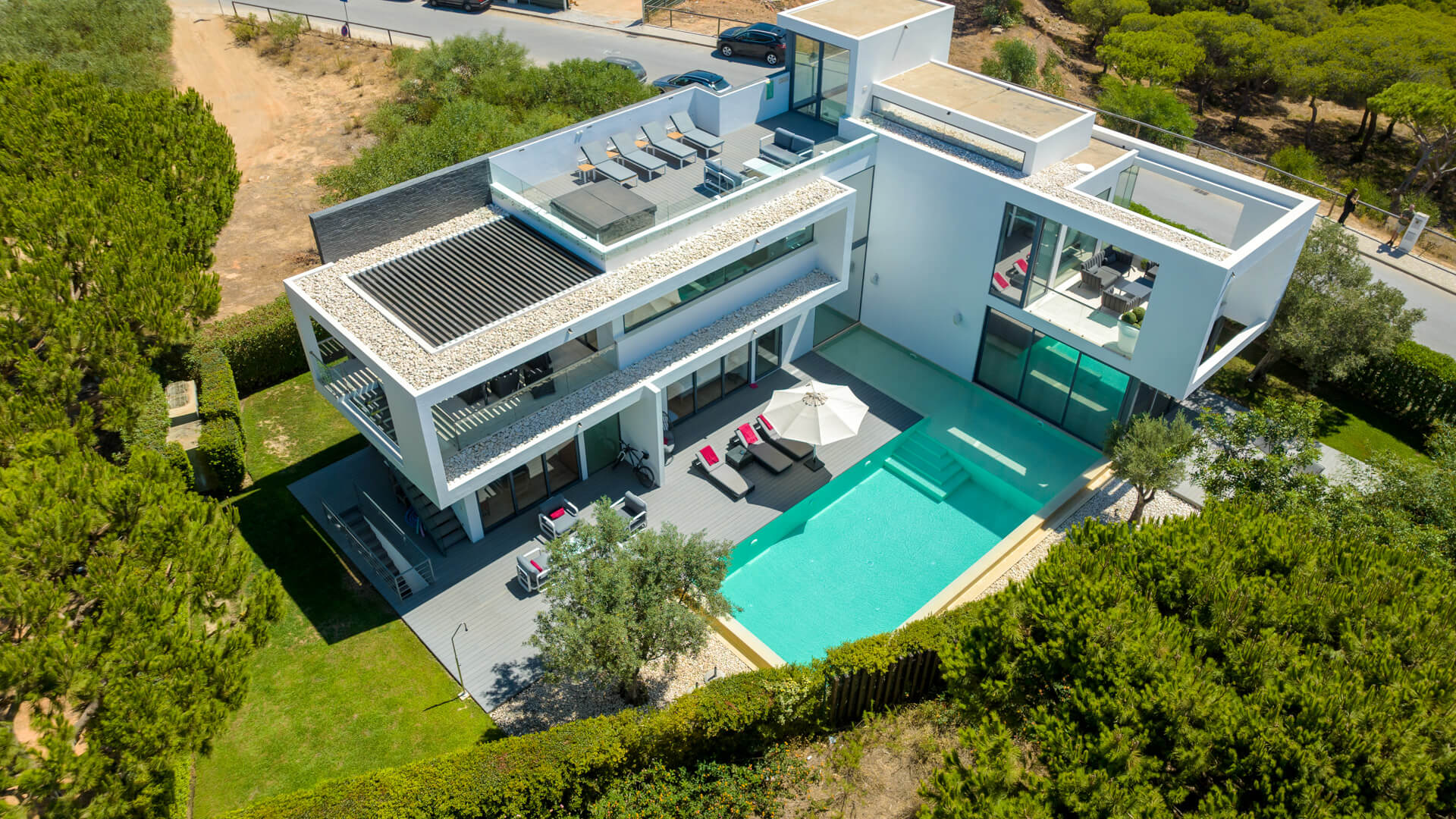 The first floor comprises the living room, modern kitchen and dining area with two distinct terrace areas – one with lounge furniture and the other with a BBQ and dining table.