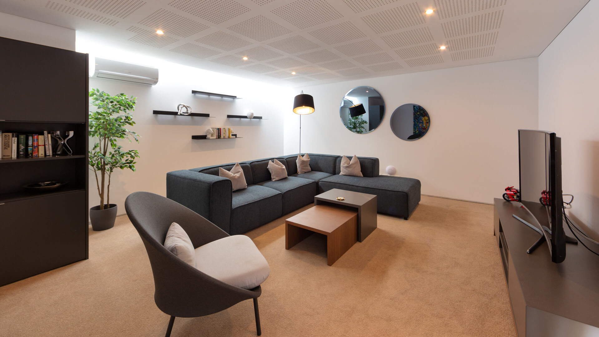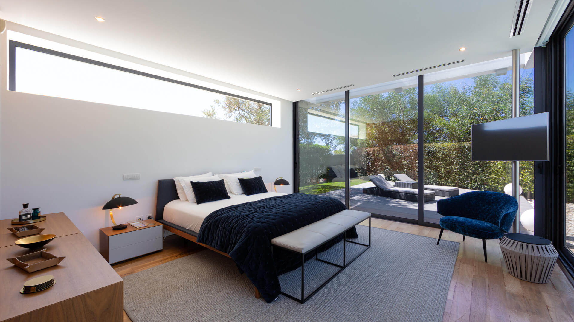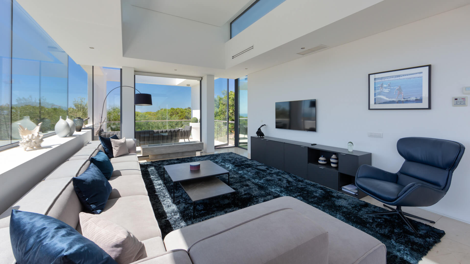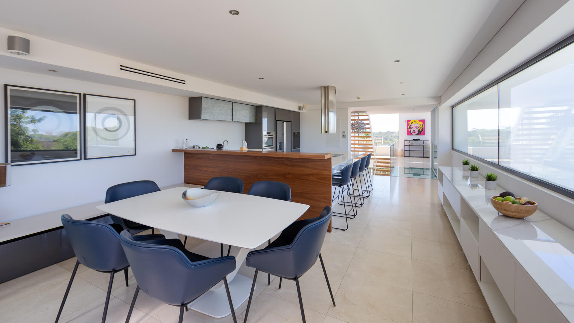 The first floor comprises the living room, modern kitchen and dining area with two distinct terrace areas – one with lounge furniture and the other with a BBQ and dining table.