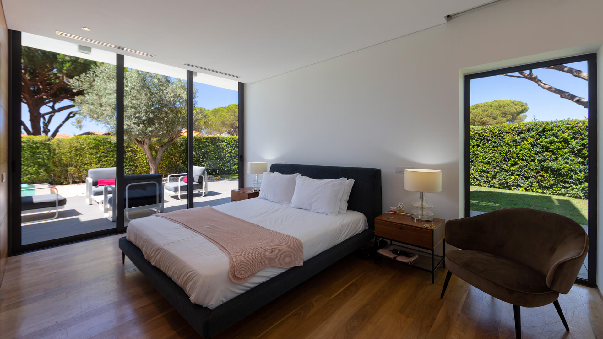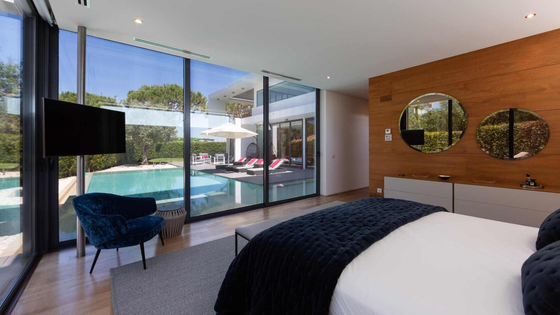 The entrance level is comprised of the entrance hall, cloakroom, a swimming pool and a beautiful garden, as well as three of the four bedrooms. Bedroom one is a double room with double wardrobes and an en suite shower room and comprises sliding patio doors leading to the pool side terrace. Bedroom two is a double room with an en suite shower room and direct access to the pool side terrace. Bedroom three is the Master double room with an en suite bathroom with bath, additional shower unit, a large separate dressing area and doors that give access to the pool side terrace.