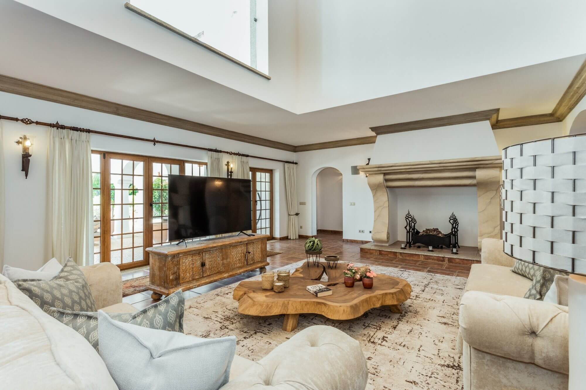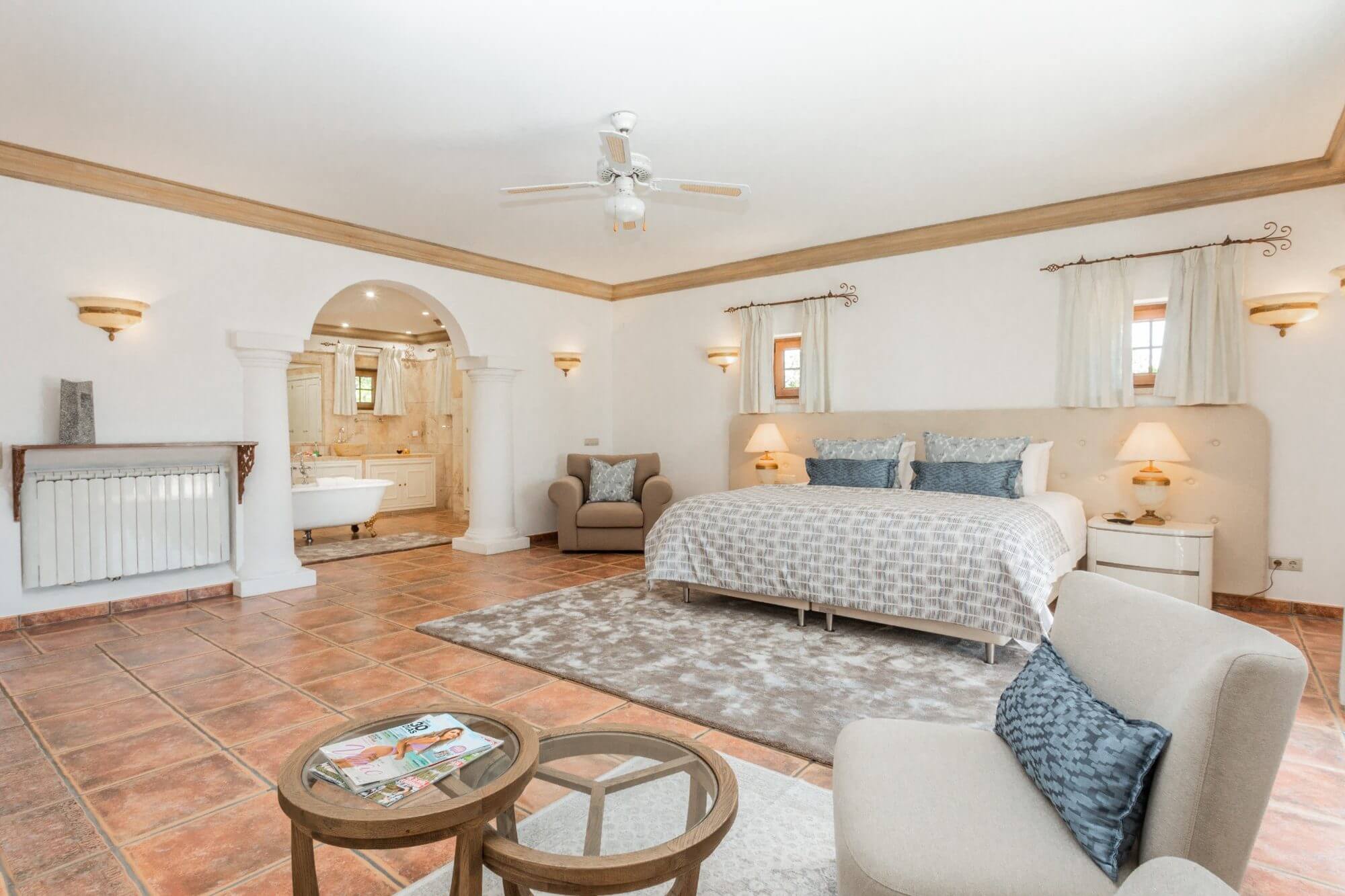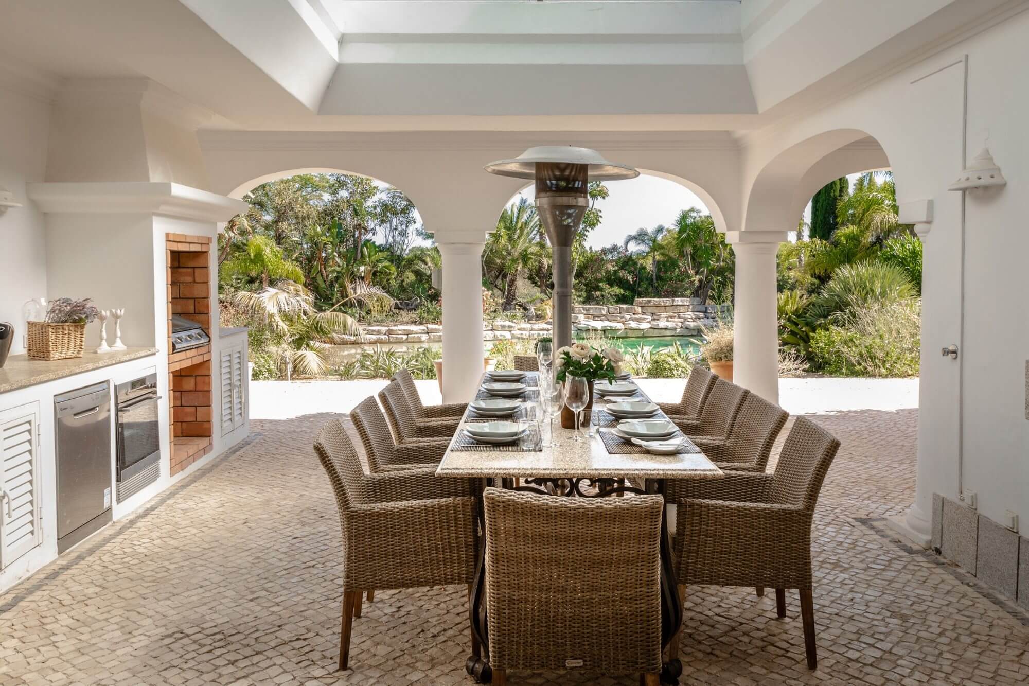 The villa features 6 large en-suite bedrooms, a spacious living and dining area, a fully equipped kitchen with centre island, and extensive outdoor terraces with an exterior kitchen and dining for up to 12 guests.
