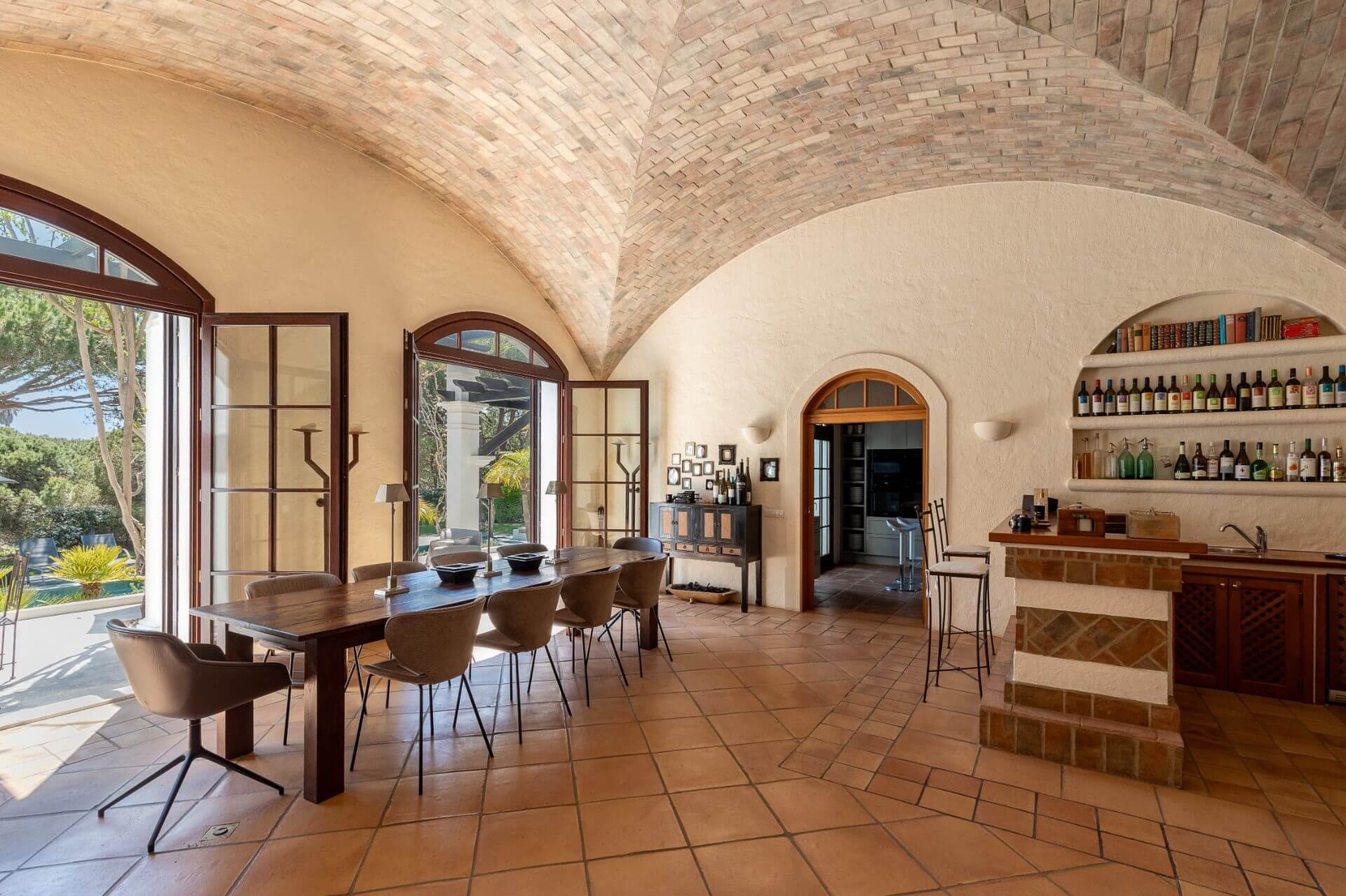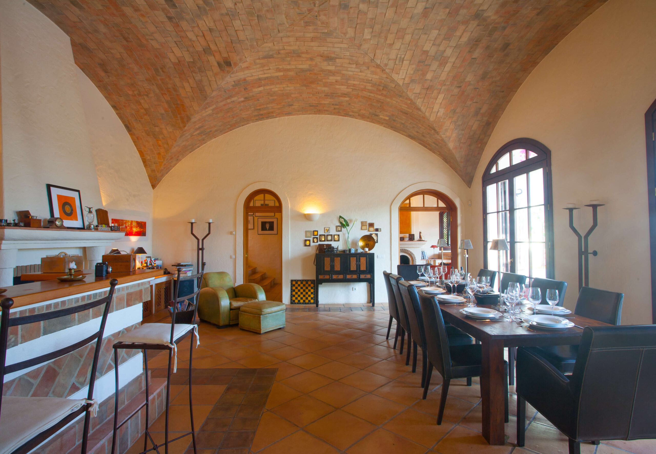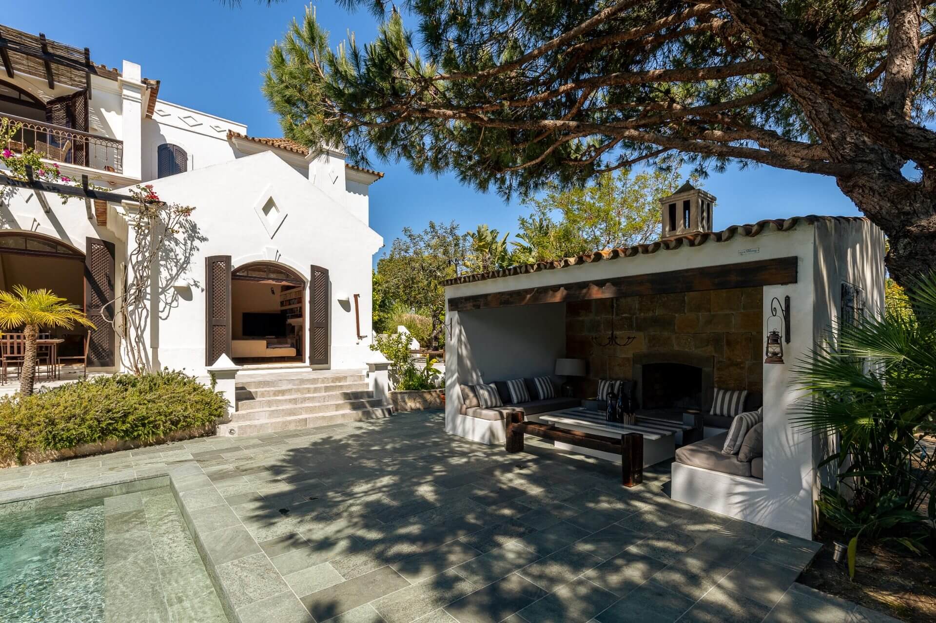 This villa built such as an Hacienda with 4 bedrooms leading to a charming outside patio which provides privacy to the guests. The main villa includes entrance hall, guest bathroom, a fully equipped kitchen, laundry with dyer and washing machine, spacious dining area with bar, fireplace, and vaulted ceiling of donkey bricks, a TV and sitting area also with fireplace with cable TV, DVD and Hifi. All the living areas and kitchen overlook the pool terrace.