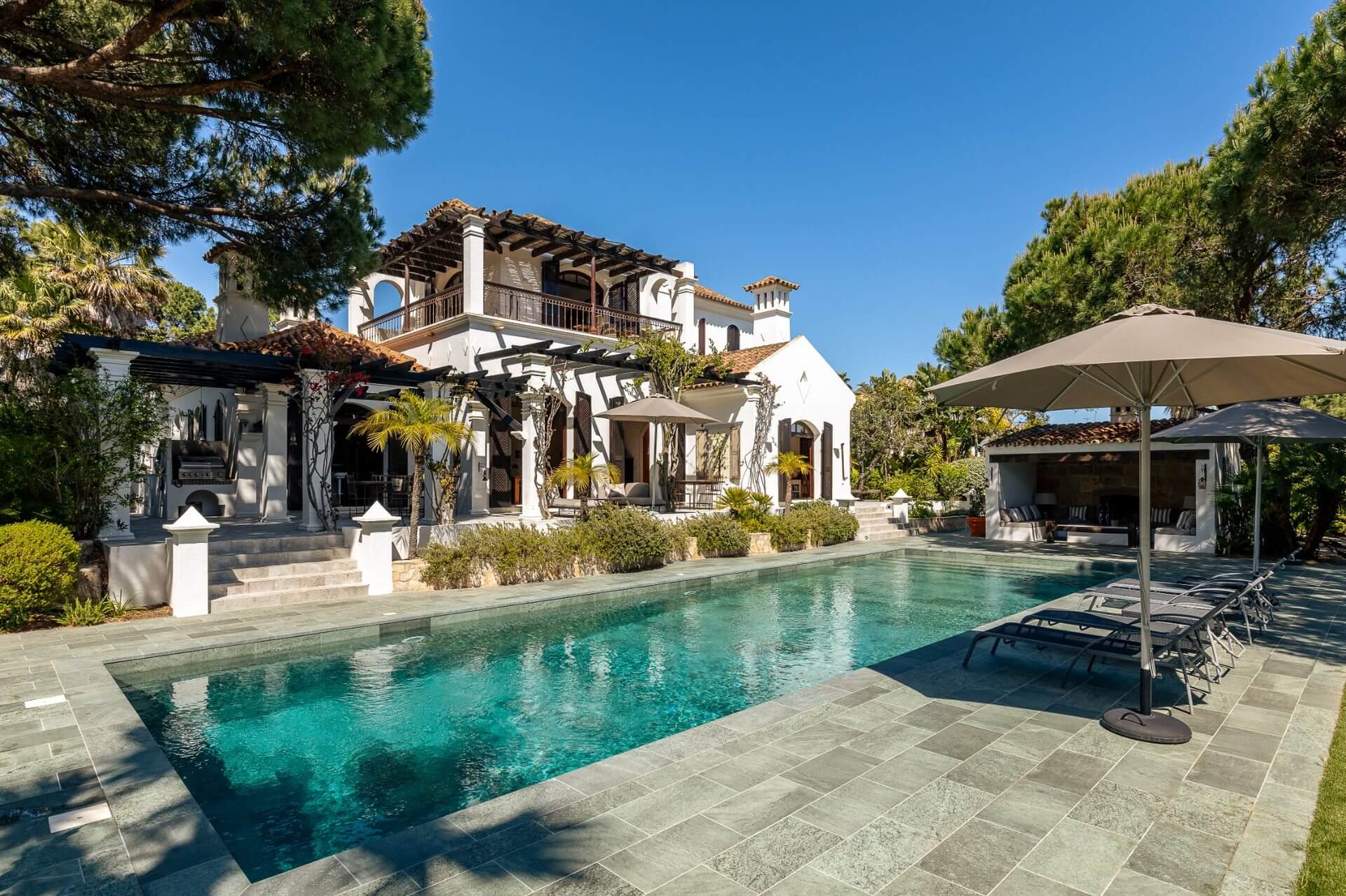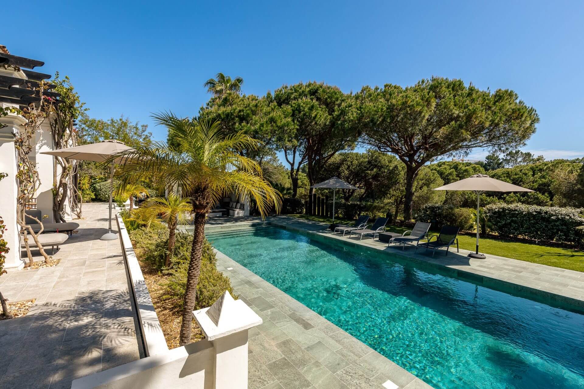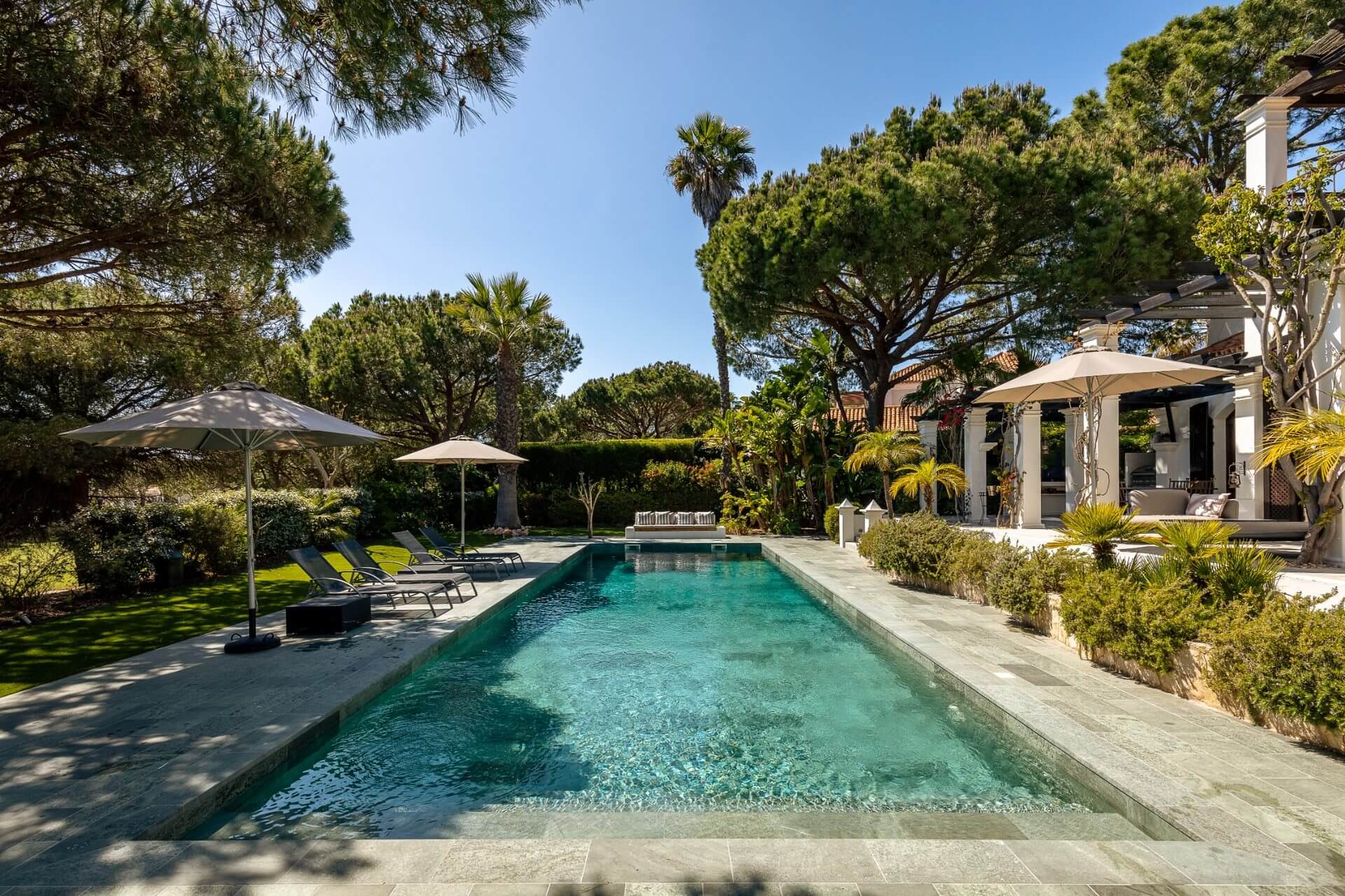 Outside is a terrace with gas barbecue and some steps down a long pool.