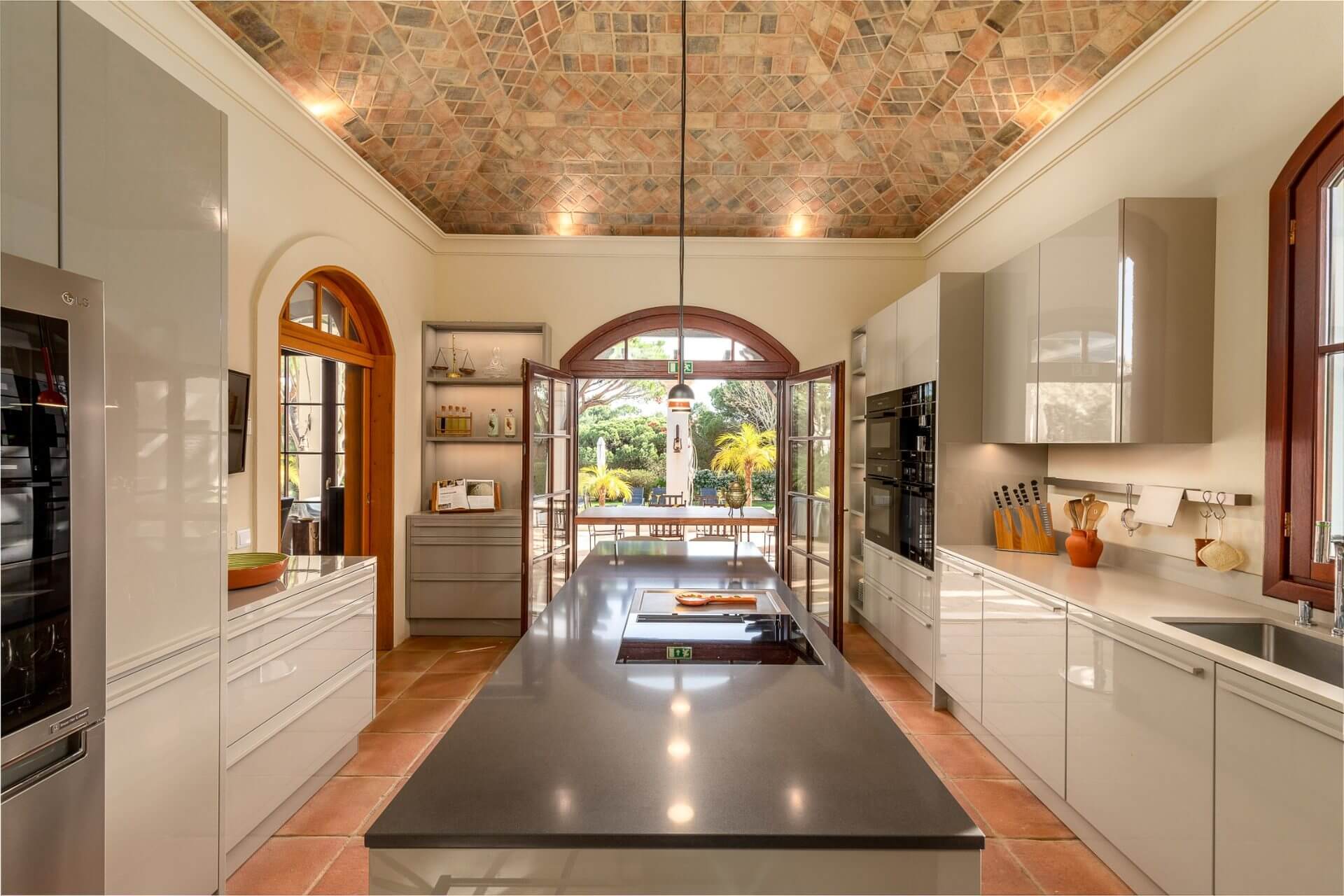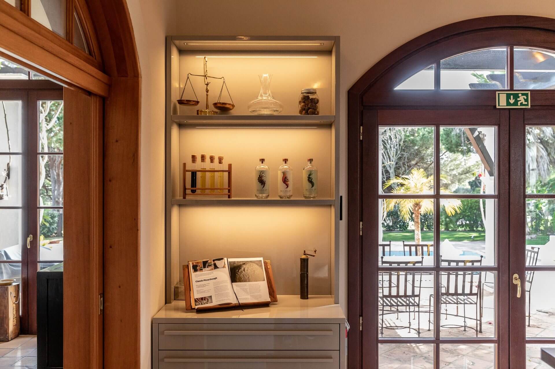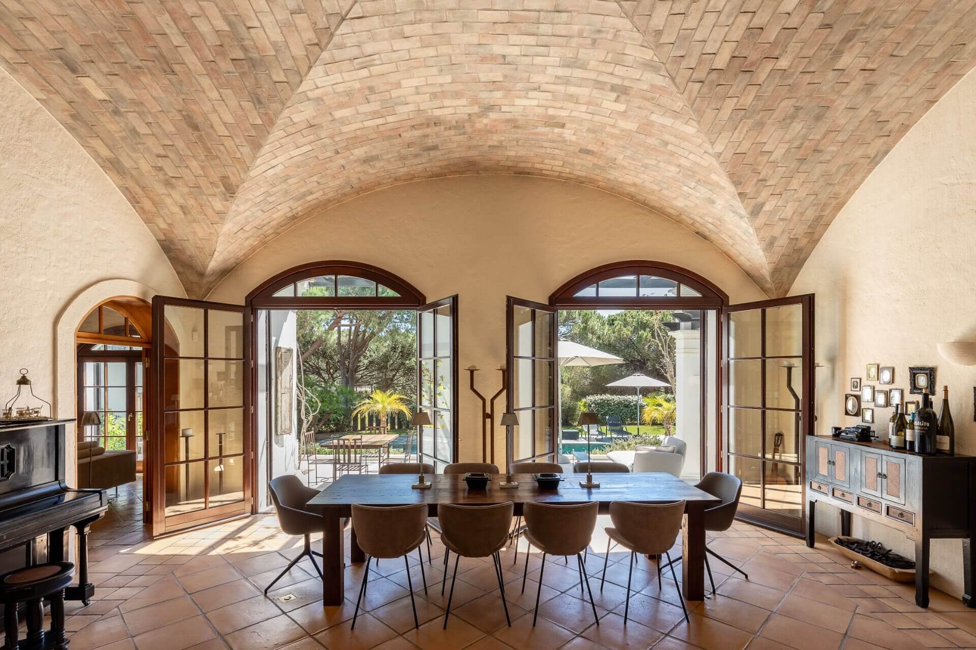 Outside is a terrace with gas barbecue and some steps down a long pool.