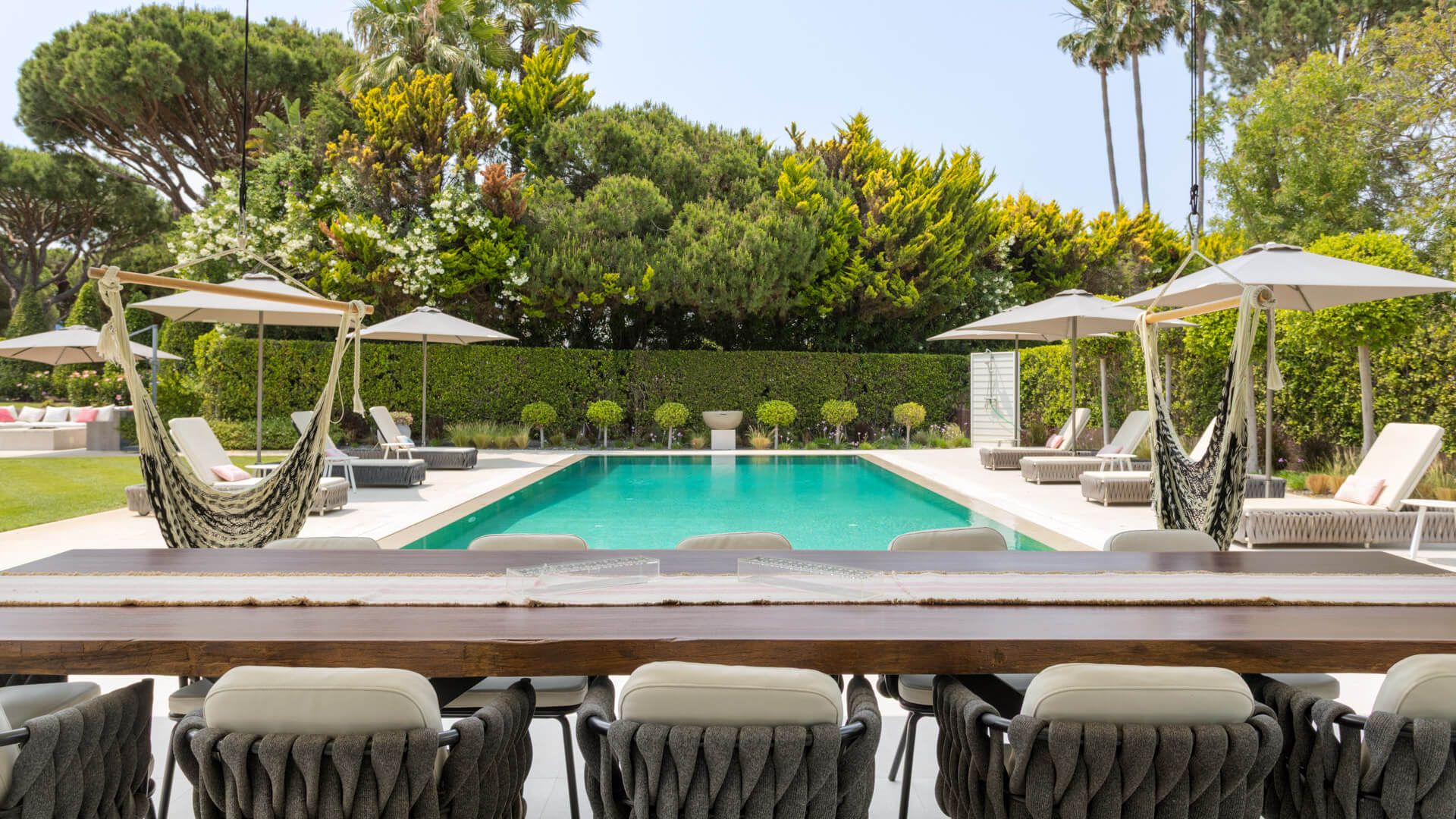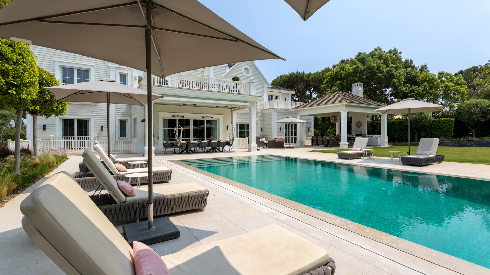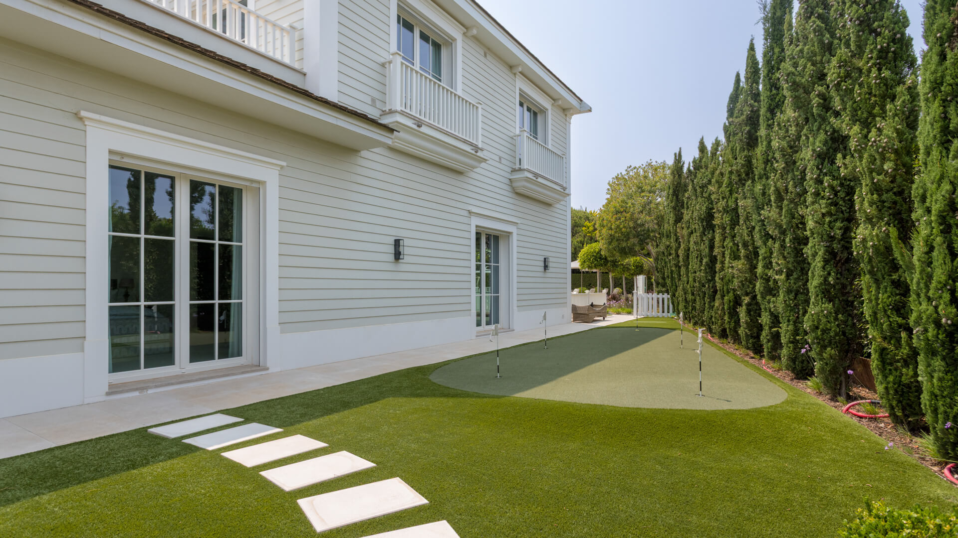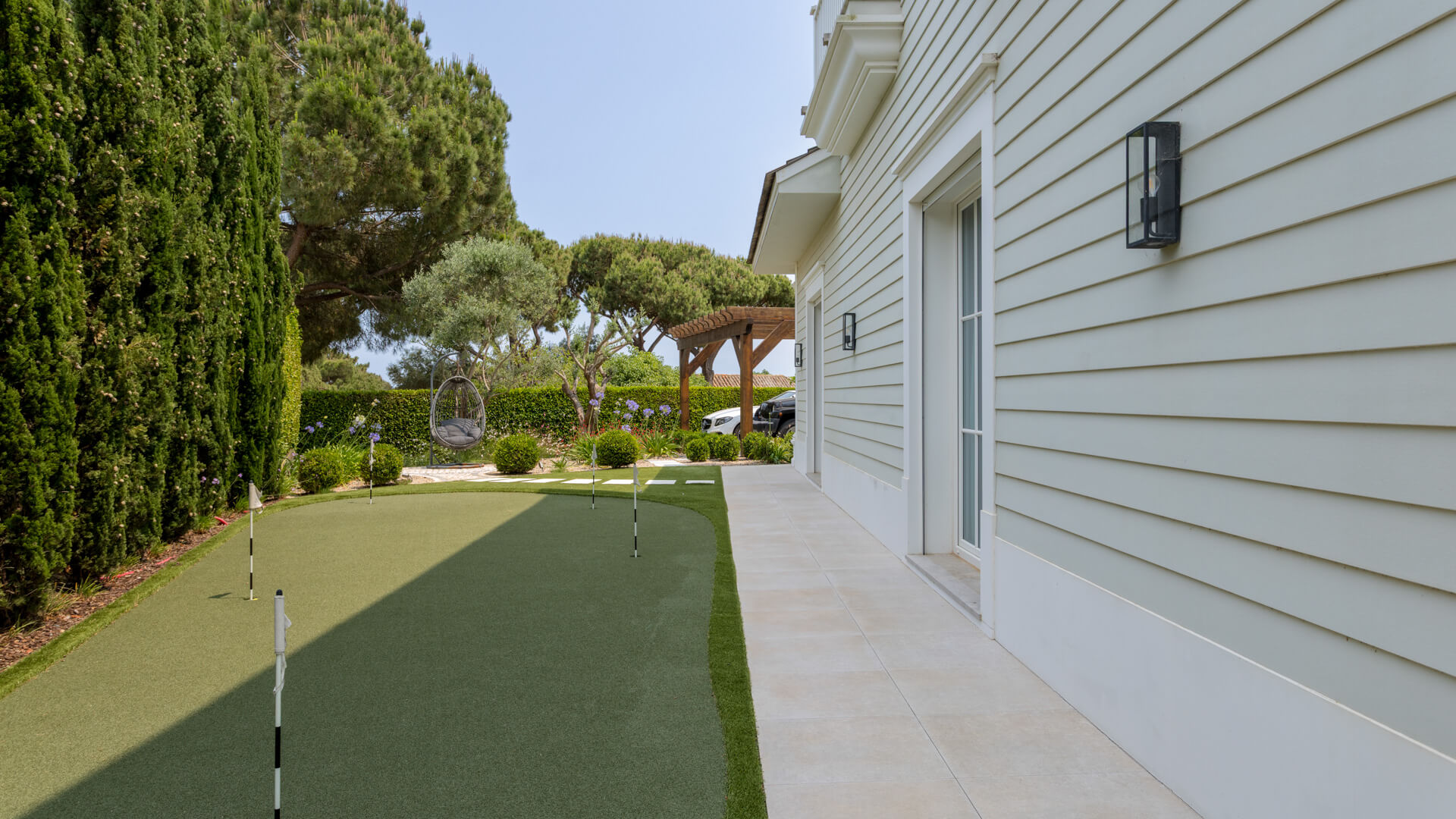The pool deck provides ample sunbathing areas, two separate dining spaces, two distinct lounging zones, and a covered BBQ area with counter seating. At the far end of the garden, there is a Padel court, while to the side of the villa, a charming putting green adds to the leisure options.