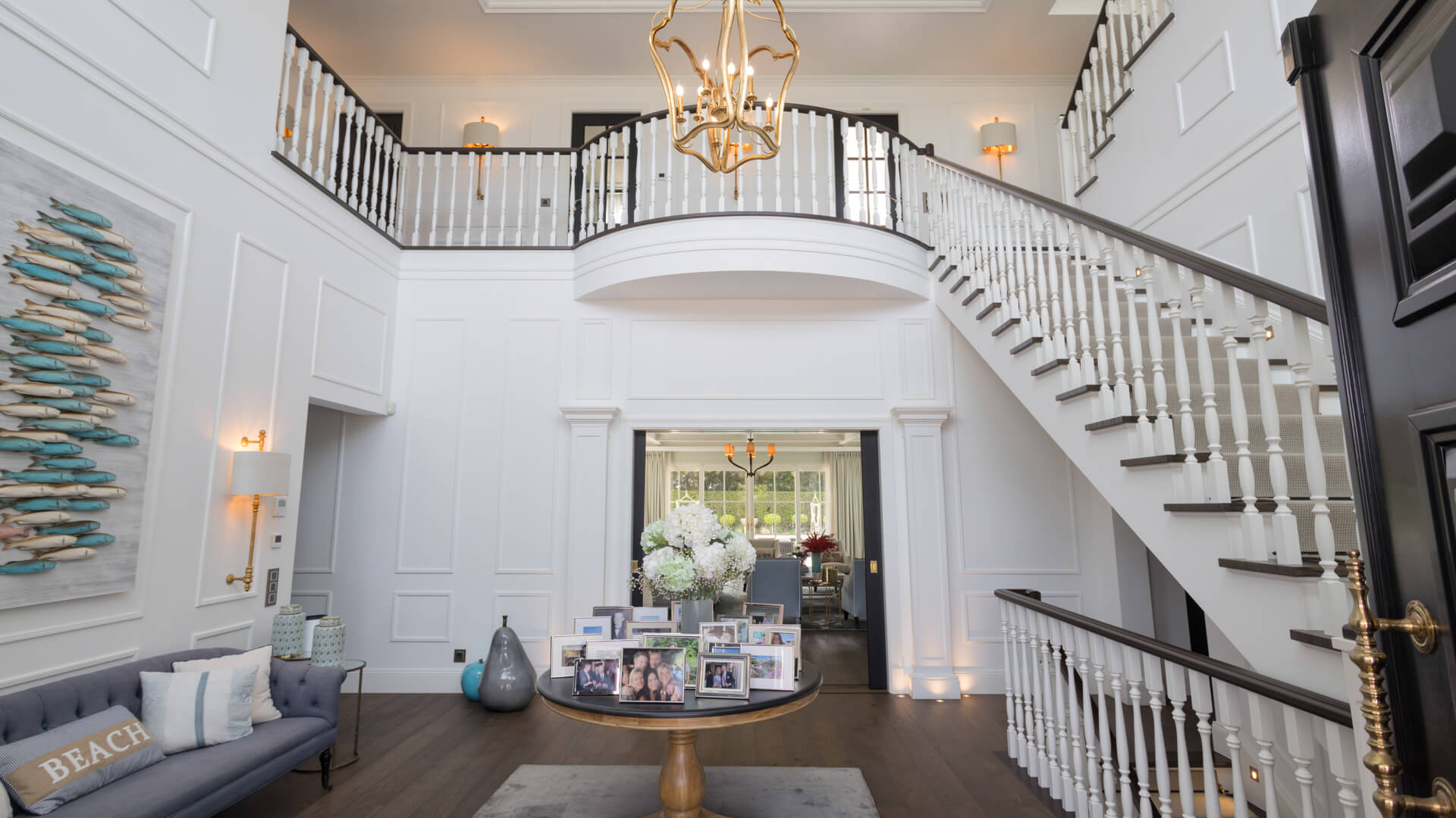 The ground floor features an impressive double-height entrance hall with a sweeping staircase, a cloakroom, a spacious living room with a feature fireplace and direct access to the pool deck, a TV/snug area, a breakfast area, a large kitchen with an island and counter seating, a formal dining room, one guest suite, and a generous master suite.
