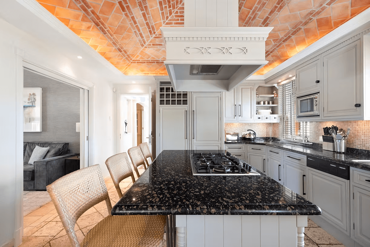 Living areas include a spacious lounge and dining area with fireplace and direct access to the terrace and pool, as well as a comfortable TV room with fireplace and cable TV with English channels.
