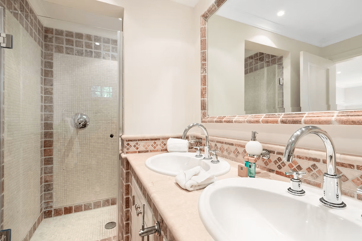 The property features five en-suite bedrooms: two double bedrooms on the first floor, including a master suite with a king-size bed and private terrace; two twin bedrooms on the ground floor, one with direct access to the pool terrace; and one double bedroom in the basement. A guest WC and an exterior WC are also available, with hair dryers provided in all bathrooms.